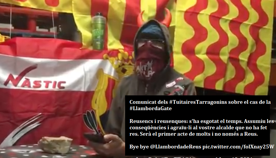 Unes peticions fetes divendres i que ahir diumenge encara no havien rebut resposta per part del consistori reusenc, motiu pel qual un Tuitaire Tarragoní anònim vestit de diable, en una habitació decorada amb la bandera de Tarragona i la del Nàstic va respondre amb el vídeo «Reusencs i reusenques: s'ha esgotat el temps». En les imatges es pot veure com aquest tarragoní anònim 'assassina' la llamborda de Reus, i anuncia el pitjor: «Ganxets, encomaneu-vos a Sant Pere perquè això només és el començament». La 'guerra' pel #LlambordaGate a Twitter està servida.... continuarà....